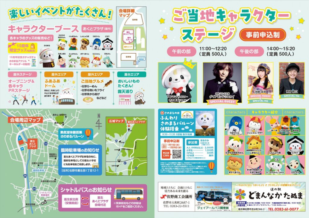 佐野市のご当地キャラクター「さのまる」の誕生日を記念した「さのまるの日イベント」を開催します。会場には、さのまるをはじめとしたご当地キャラクターが集まり、ステージイベントやキャラクターブース、飲食ブースなど、幅広い世代で楽しめる内容です!