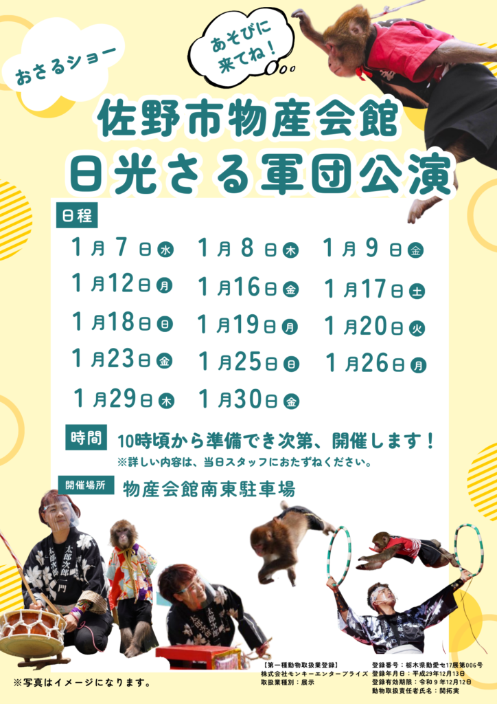 佐野市物産会館にて、日光さる軍団による公演を開催します。