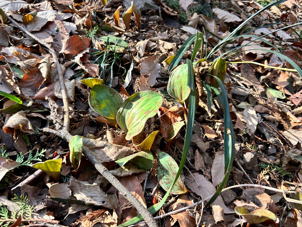 例年の開花時期は3月中旬~ですが、お問い合わせも頂き始めたため、掲載いたします。現在は写真のように開花はまだですが芽は確認できます。キツネノカミソリ等の芽やカタクリ以外の花は少しですが咲いております。